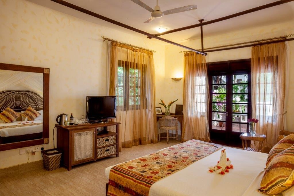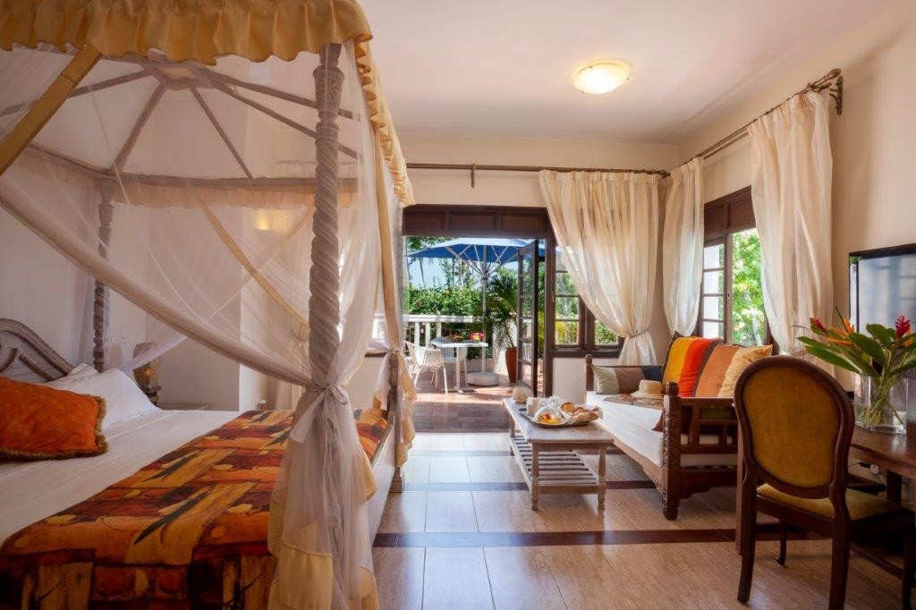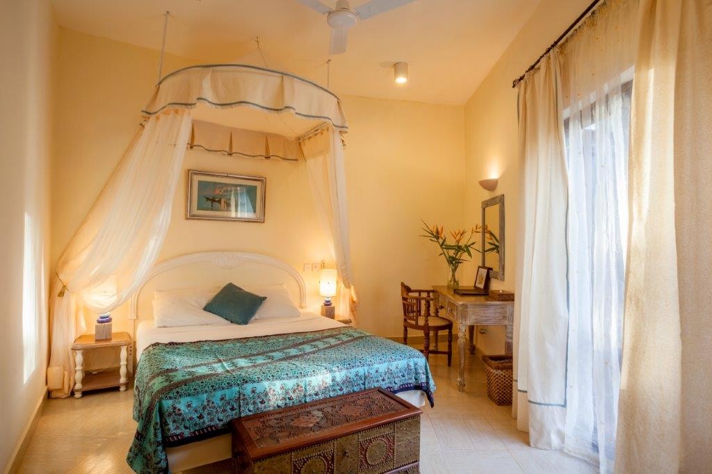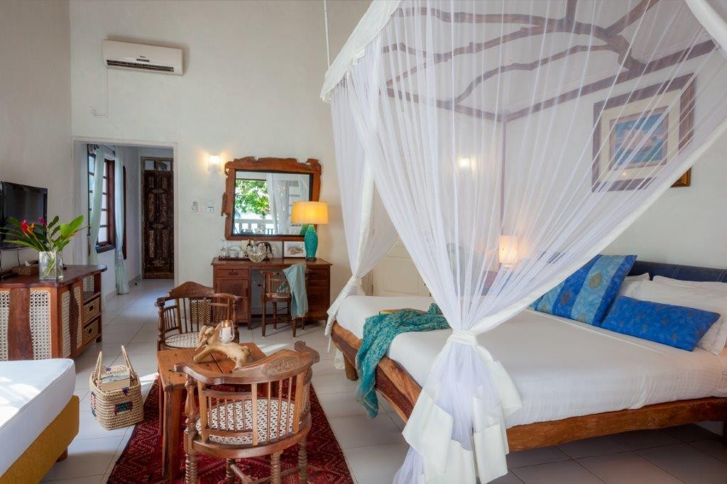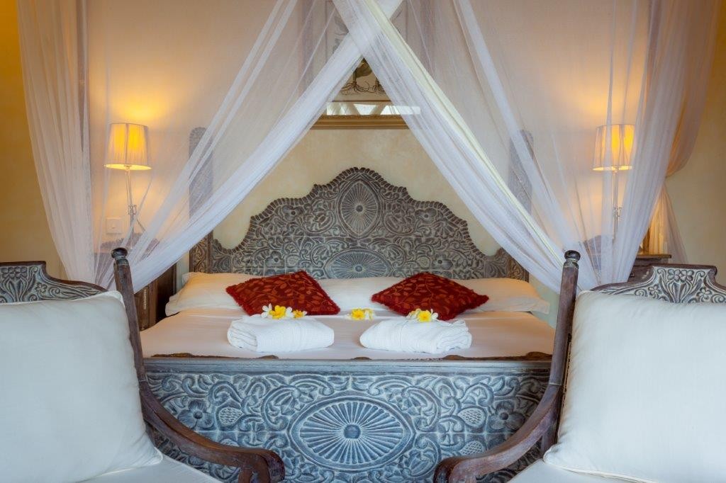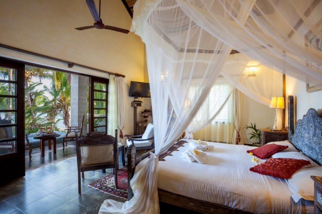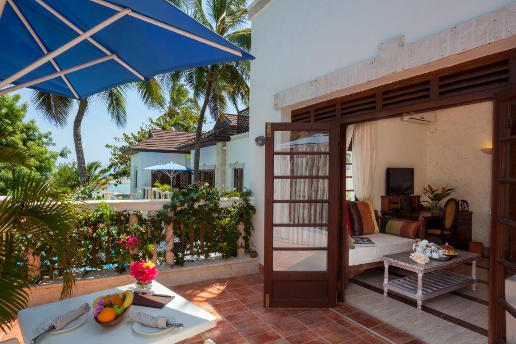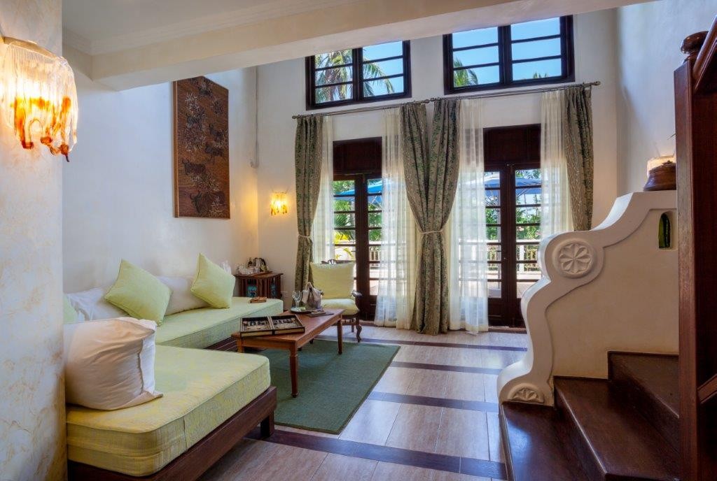 Each of the 15 rooms attests to distinctive flair: from ocean-view and garden suites to a private Jacuzzi suite and executive suite—all elegantly appointed with Swahili antiques, tribal artworks, driftwood sculptures, and bold contemporary African paintings.