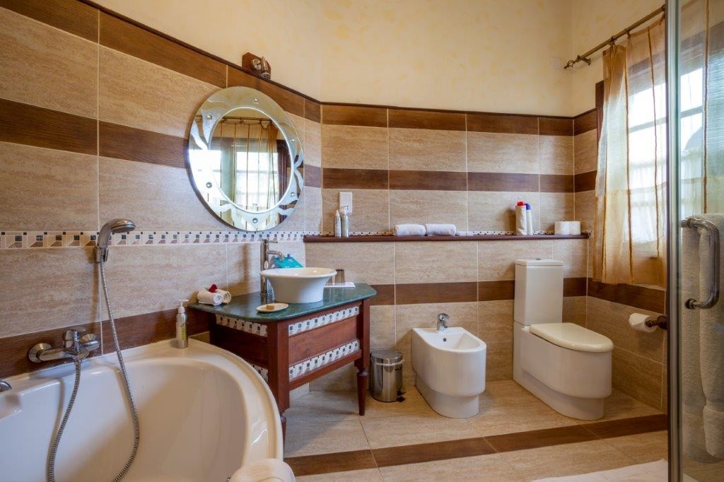 Amenities include air conditioning, mini-fridge, in-room safe, TV, tea/coffee facilities, and eco-friendly toiletries. Bathrooms feature plush robes and locally made bath products.